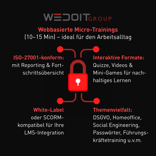 - Themenvielfalt: DSGVO, Homeoffice, Social Engineering, Passwörter, Führungskräftetraining u.v.m.